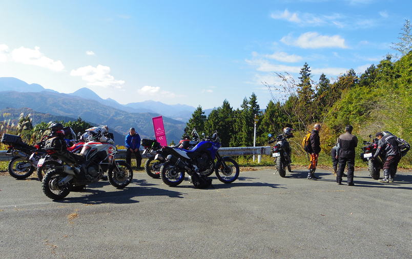 途中の公園広場で遅めのランチとおしゃべりを堪能し、次に向かうは御荷鉾スーパー林道展望台です。そこまでもダート林道は続き、展望台では天候にも恵まれ素晴らしい景色を堪能しました。