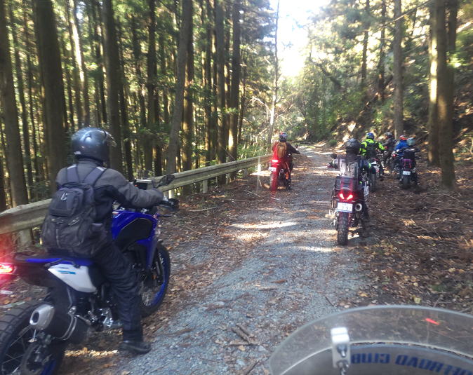 短めのフラット林道を走りながら、荷物の脱落があったりそれさえも話のネタとしながら和気あいあいツーリングは進行しました。御荷鉾スーパー林道はやはり走りやすく長めの素晴らしい貴重な林道で、走行していて気持ち良いですが、だからこそ走行車両も多いので特に対向車に注意しながら走行しました。