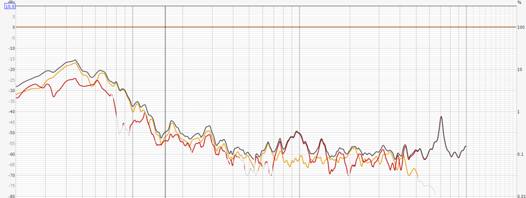 歪み 黒 総合 赤 2次 橙 3次 思ったより、歪みが少ないです。-60dB(0.1%)が合格ラインです。