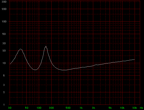 容積の制約により、157Hzから綺麗に減衰しています。右は、インピーダンス特性で、参考にしてください(REWでは、この測定はできません)。低域の過入力保護回路付きですが、実験で使用した物は、スピーカーのみに改造してあります。口径の割に能率が高く、音圧特性も素直です。