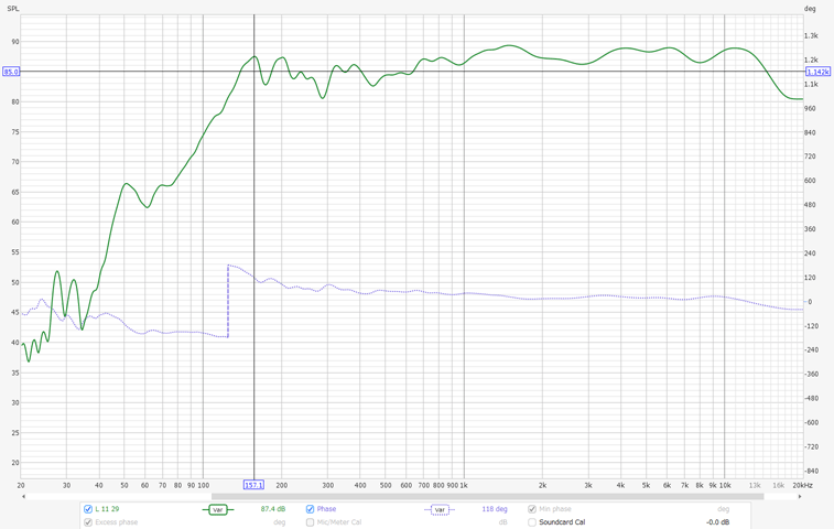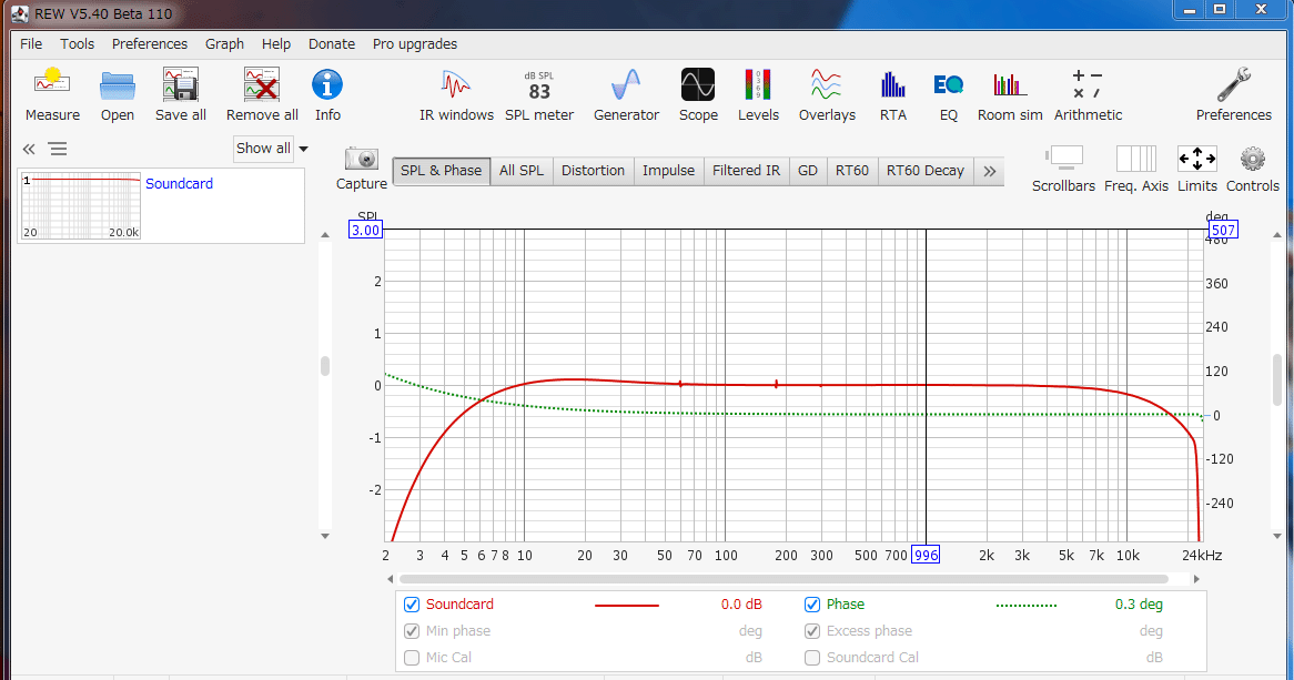 オーディオ用SPの定格は、連続入力値では有りませんので、入力に不安が有れば、スピーカーと、測定マイクの距離を50cm程度まで近づけます。GeneratorのNoiseパネルには、同じ音源が有りますので、色々音出ししてみてください。。SPLの校正が済めば、SPL & Phaseグラフの縦軸値が信頼できるものとなります。