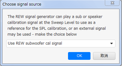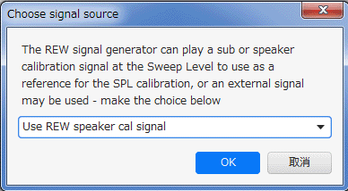 signal sourceが開きますので、デフォルトのサブウーハー校正用信号の所を、スピーカー校正信号に変え、OKボタンを押して、信号を発生させます。騒音は、A特性を使用しますが、低域のフィルターが極端なので、音響調整はC特性が標準です。Z特性でも問題は有りませんが、音響界では一般的ではないようです。