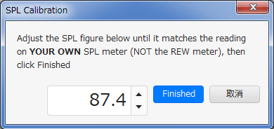音が出てしばらくすると、下のSPL Calibrationウィンドウが開きますので、▲▼で、SPLメーターの表示値に合わせ、Finishedを押せば、校正が完了します。