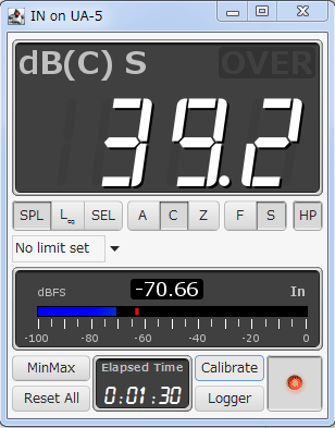 REWのメニューから、SPL meterをクリックすると。下の2つのウィンドウが開きます。UA-5を使用していますので、IN on UA-5のウィンドウで、各ボタンを、SPL、C、S(スロー)とし、Calibrateボタンを押すと、右側のChose