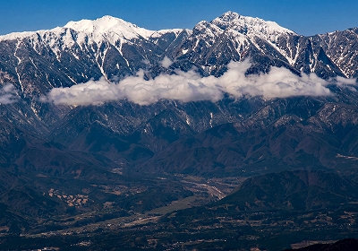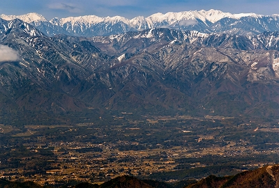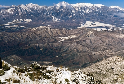 | 金峰山山頂から中央アルプス (右奥の最高点が木曽駒ヶ岳、左端が空木岳) |