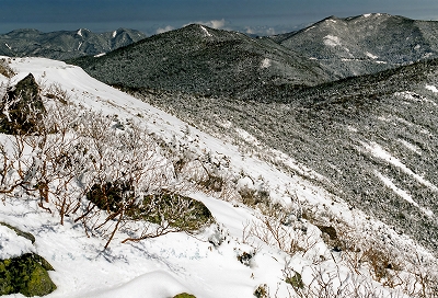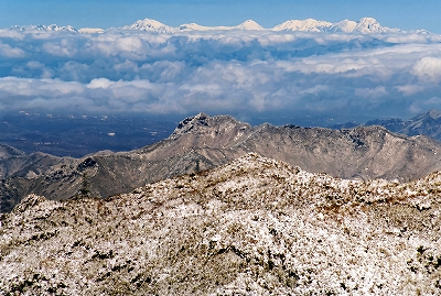 | 金峰山への登りで八ヶ岳を望む (左から、編笠山、権現岳、赤岳、横岳、硫黄岳、天狗岳) |