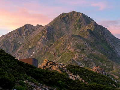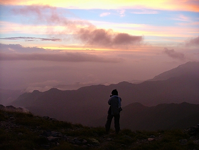 | 夕照の北岳 (北岳山荘幕営地から) | 北岳山荘幕営地 ――日の出を待つ | |