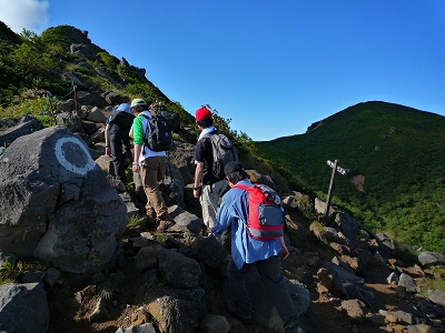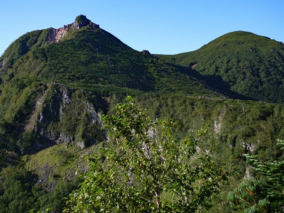 | 東天狗岳(左)と西天狗岳(右)を望む | 東天狗岳に登る (遠景は東天狗岳と西天狗岳) | |