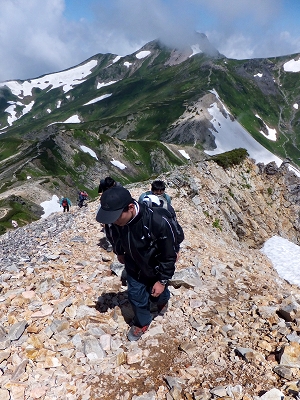 | 白馬岳山頂から頂上宿舎に向かう 遠景は、杓子岳(手前)と鑓ヶ岳(奥) |