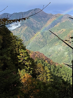 | 本仁田山に架かる虹 | 鋸尾根を下る (遠景は本仁田山) | ||