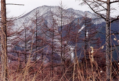そして三頭山への最後の登りにさしかかった。急な登りも一息で山頂の三頭山西峰に着いた。北側の斜面からは奥多摩の山々が一望できた。石尾根から雪に覆われた雲取山まで、見渡すことができた。なんとも爽快な気分で下りに入った。途中東峰に行く道との分かれ道にたどりついたが、迷わず巻き道を通ることに決定。尾根道からはときおり奥多摩湖なんかが見えたりした。