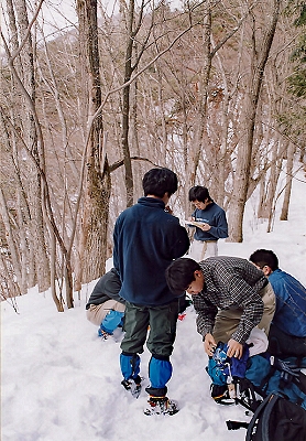 満員の車内の中1時間以上、仲ノ平に到着した。けれど3人バス酔いでダウンという始末。しかも、「もう少し休もう。」という部員の意見を軽く聞き流し、休憩もそこそこに体操もせず出発という暴挙に出たCLが1名。あえて名前は出さないけど。ねえM・K君。 林道を15分位歩くと、登山道に入った。ここでアイゼンとロングスパッツを装着した。初めてということもあって、時間がかかってしまった。2つのパーティーに抜かれ出発。かなりのハイペースで登っていった。すぐに追い越し、少しずつ急登になっていた。そのハイパースとバス酔いのせいで1本目からバテてしまった。休憩後20分位で西原峠に着いた。もう午前11時を過ぎていたのでここで昼食をとってはどうかという意見があったけれど、あくまで予定通りということで三頭山避難小屋まで歩くことにした。
