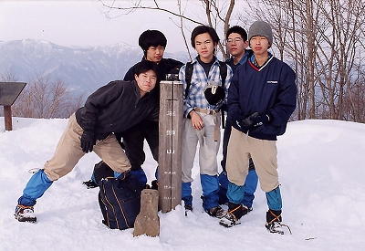 尾根が狭くなり、急登に入った。展望もなくなりさらに雪深くなった登りを登ると大沢山の山頂に着いた。けれど、またしても、K先生、F先生を置いていってしまった。僕はハイペ−スを続けるCLに憤りを感じつつ、「少し待つ?」と問い掛けてみたものの、「後少しで避難小屋だから先に行って、食事の用意をしよう」というY・Kの鶴の一声で行くことになった。(というより自分がバテていたから待とうと言っただけなんだけど。)
