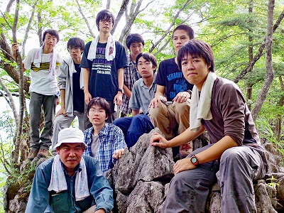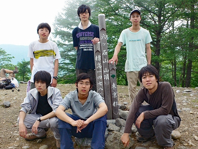 結局パーティーは6人になってしまい、それなのにこれでもかと続く登り坂。上を向いて歩くと涙がこぼれてしまいそうだったので、足元に気をつけて歩くことにした。道中蝉のような声がしていて、疲れに不気味な要素が加わったが、なんだか山頂が近い気がして来たので、頑張った。先輩とT先生の話を聞いていたら、理工学部は週3でレポートという凄まじいことを耳に挟んでしまった。……まだ、2年考える時間がある。山に集中しよう。と思っているうちに3回目の休憩。そこはだいぶ山頂に近かったらしく、休憩地から山頂はあっという間だった。